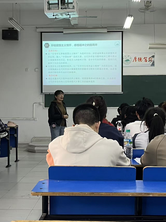 10月28日,计算机与大数据科学学院张丽芬老师在计科A2552班开展《程序设计基础I》课程思政示范课。张老师以“祖冲之的圆周率与编程中的迭代思想”为主题,将中华优秀传统文化、奋斗进取精神与程序设计专业知识深度融合,呈现了一堂兼具知识性、思想性与趣味性的课程思政教学示范课。学院教学督导及各教研室教师代表走进课堂听课,共同探讨课程思政与专业教学的融合路径。